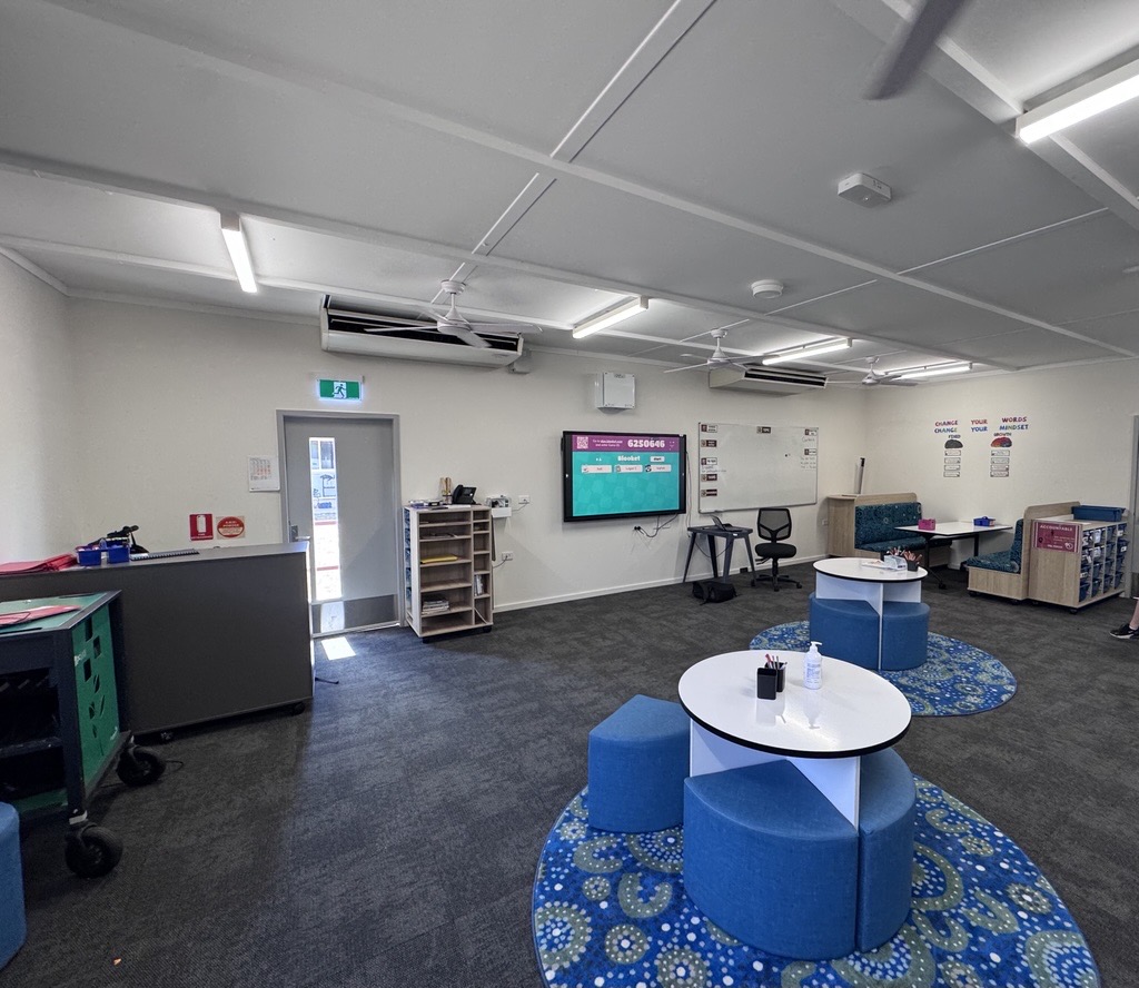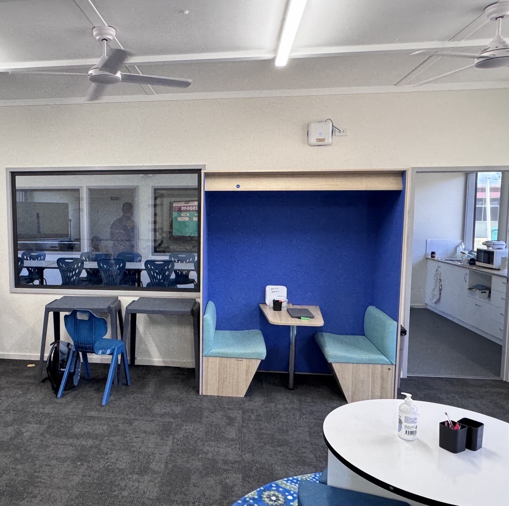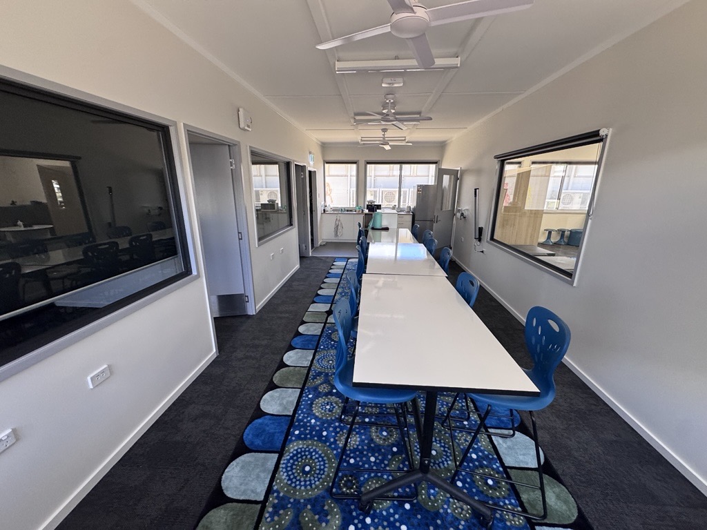 The FlexiSpace at St George State High School is a flexible learning environment designed to support student engagement, wellbeing, and successful re-entry into mainstream classroom learning.